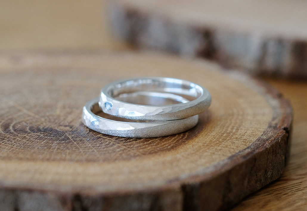 リングは職人による鎚目とマット加工のコントラストが映えるデザインに、そしてリング素材はカジュアルに着けこなせるシルバー製でお作りいたしました。