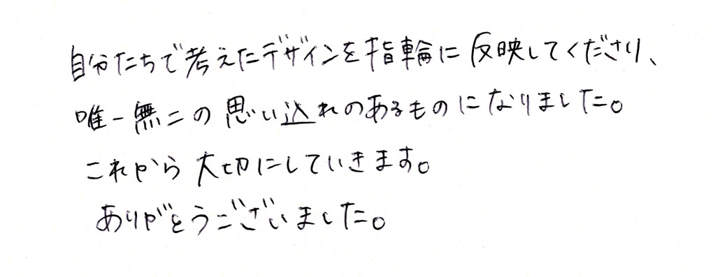 自分たちで考えたデザインを指輪に反映してくださり、唯一無二の思い入れのあるものになりました。
