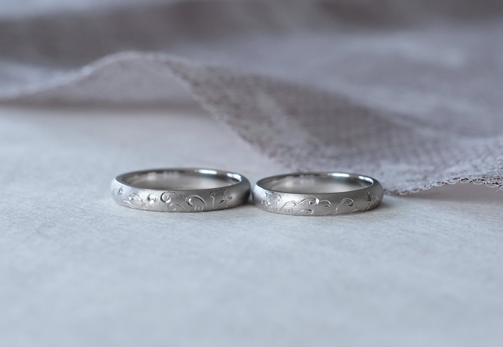 職人による和彫りをメインとしたシックなオーダーメイドの婚約指輪です。