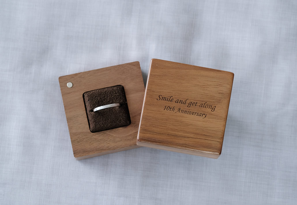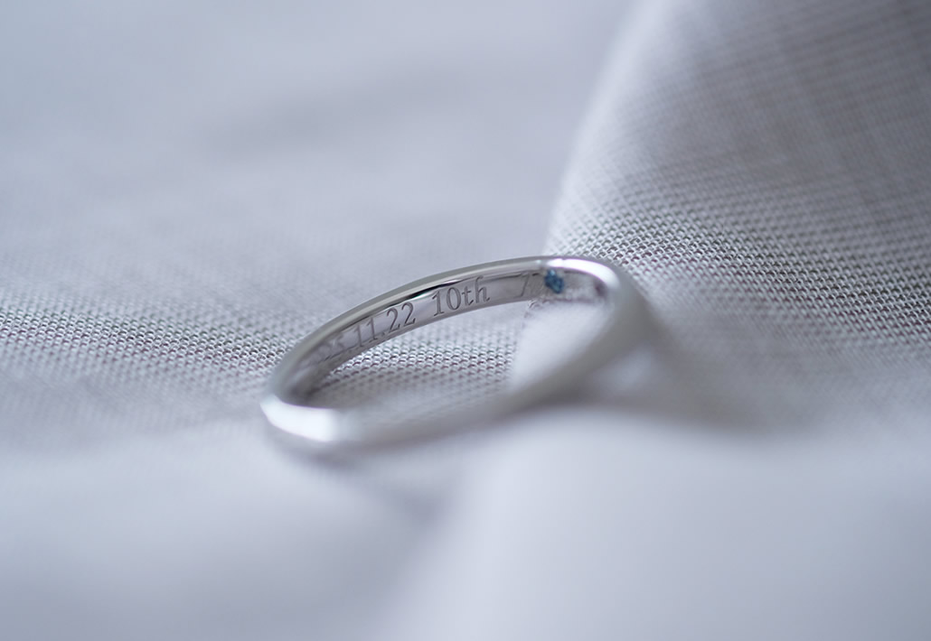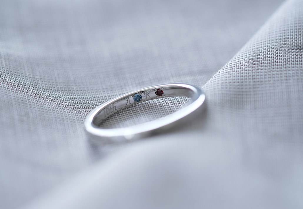 結婚10周年を記念して、ご主人から奥様へサプライズでご依頼いただいたプラチナ製のアニバーサリーリングです。内側には結婚記念日、そしておふたりのイニシャルと誕生石をいれました。