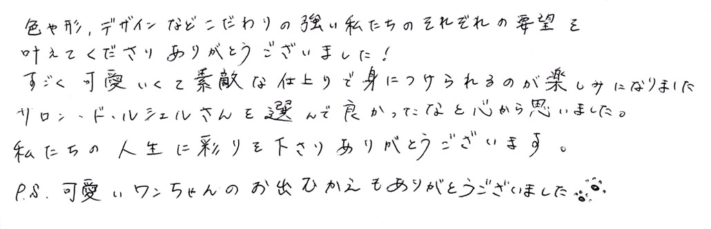 色や形、デザインなどこだわりの強い私たちのそれぞれの要望を叶えて下さり、ありがとうございました!