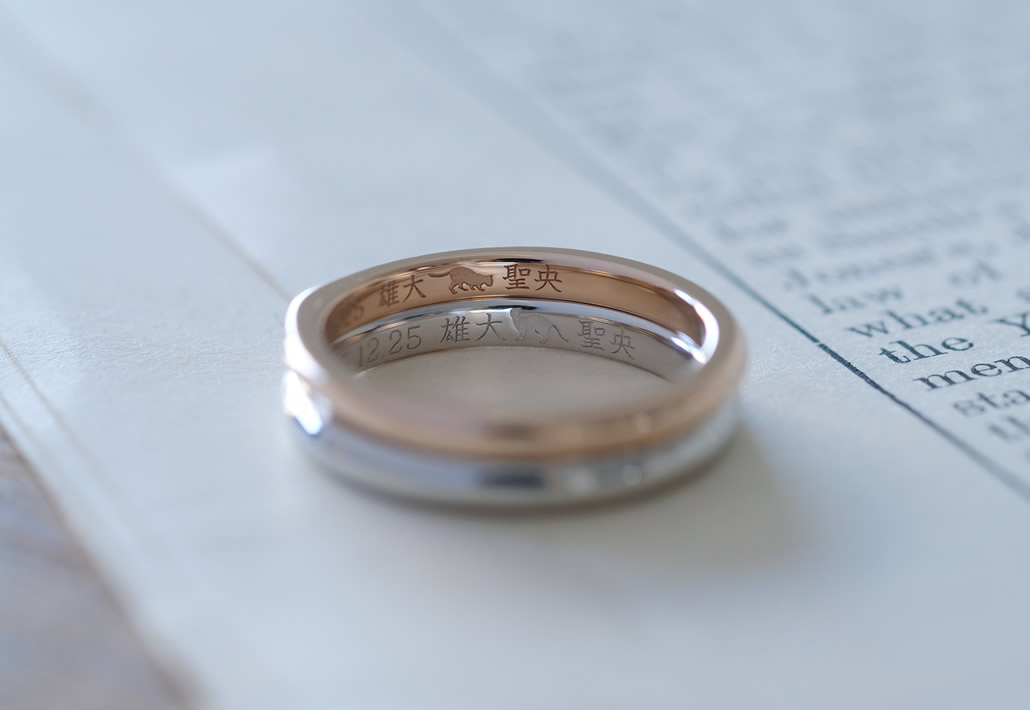 内側には2匹の向き合う猫のシルエットを彫刻し、さりげないおふたりらしさが感じられます。