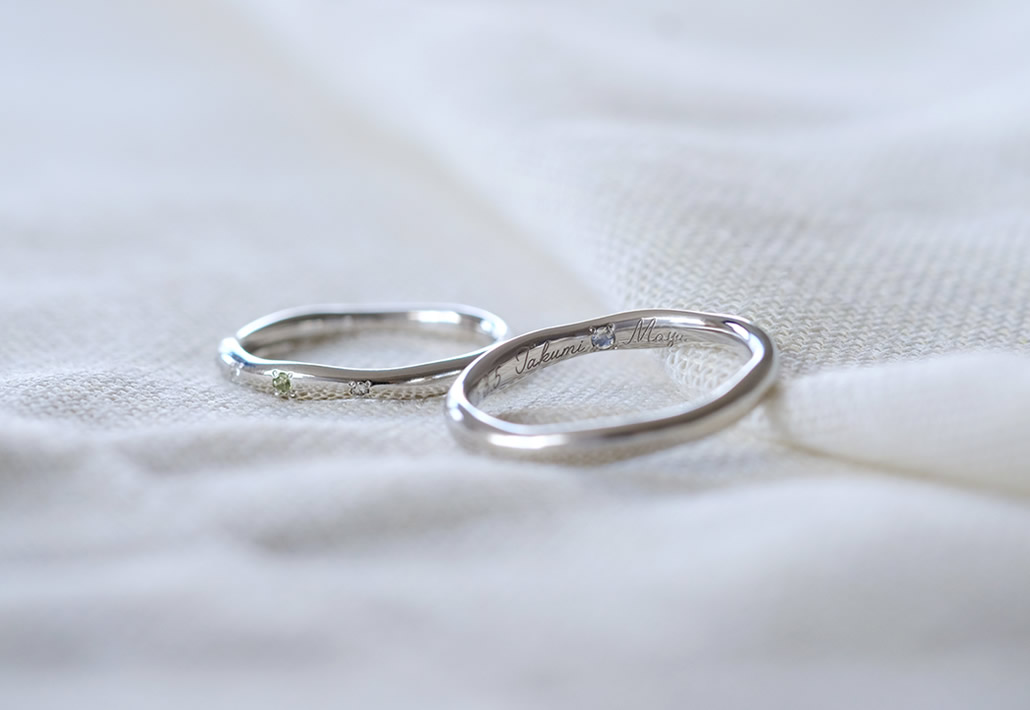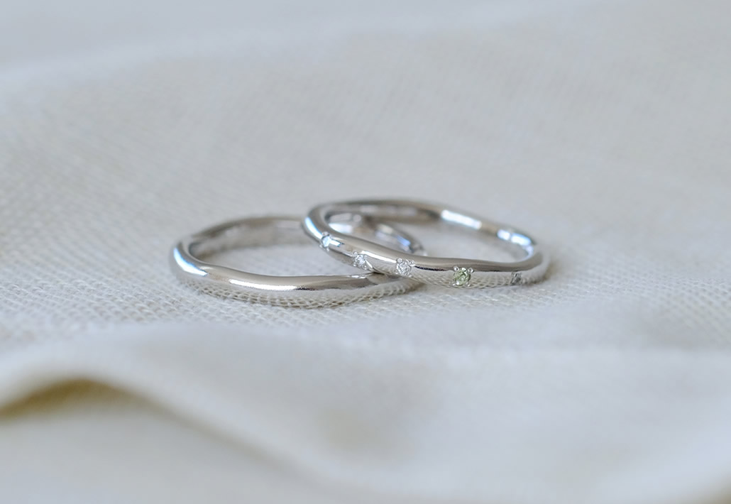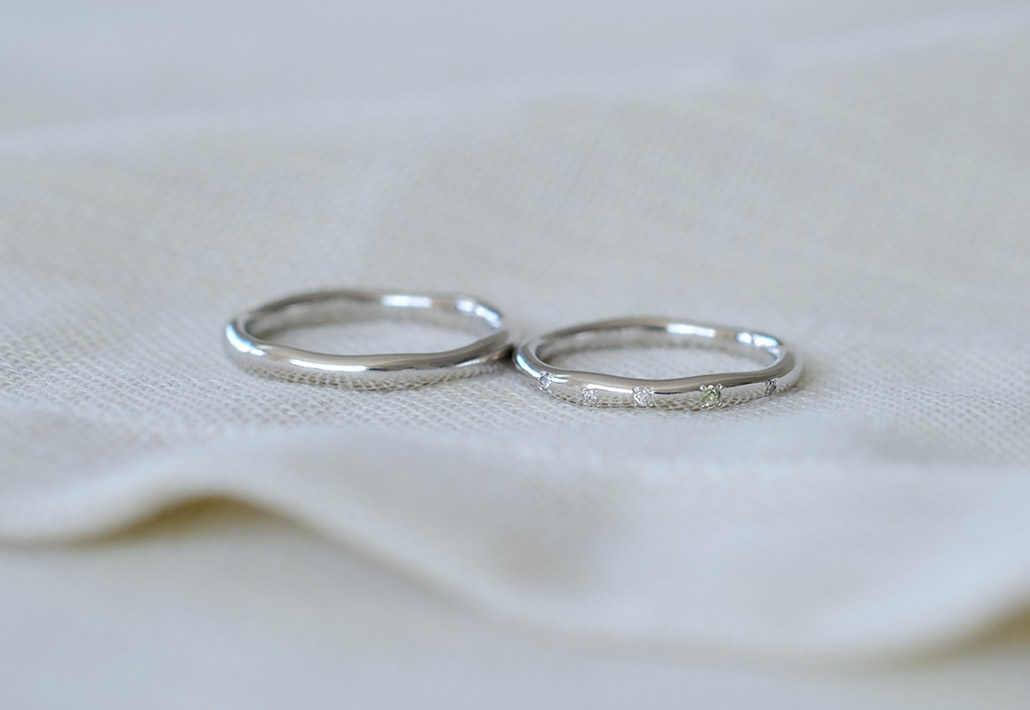 指輪本体をゆるやかに幅をランダムに仕上げたナチュラルテイストなマリッジリングです。