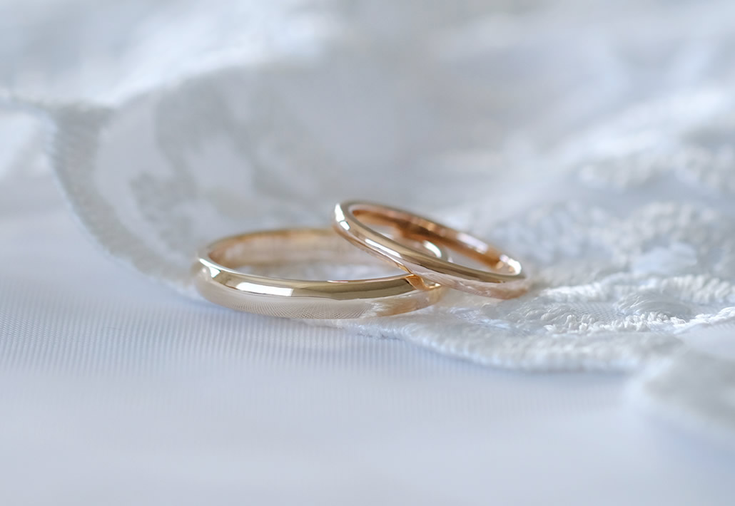 新婦様はお気に入りの婚約指輪と重ね付けがしたいとのご希望でしたので、合わせて着けた際のバランスや色合いを考えながら、シンプルなデザインをお選びいただきました。